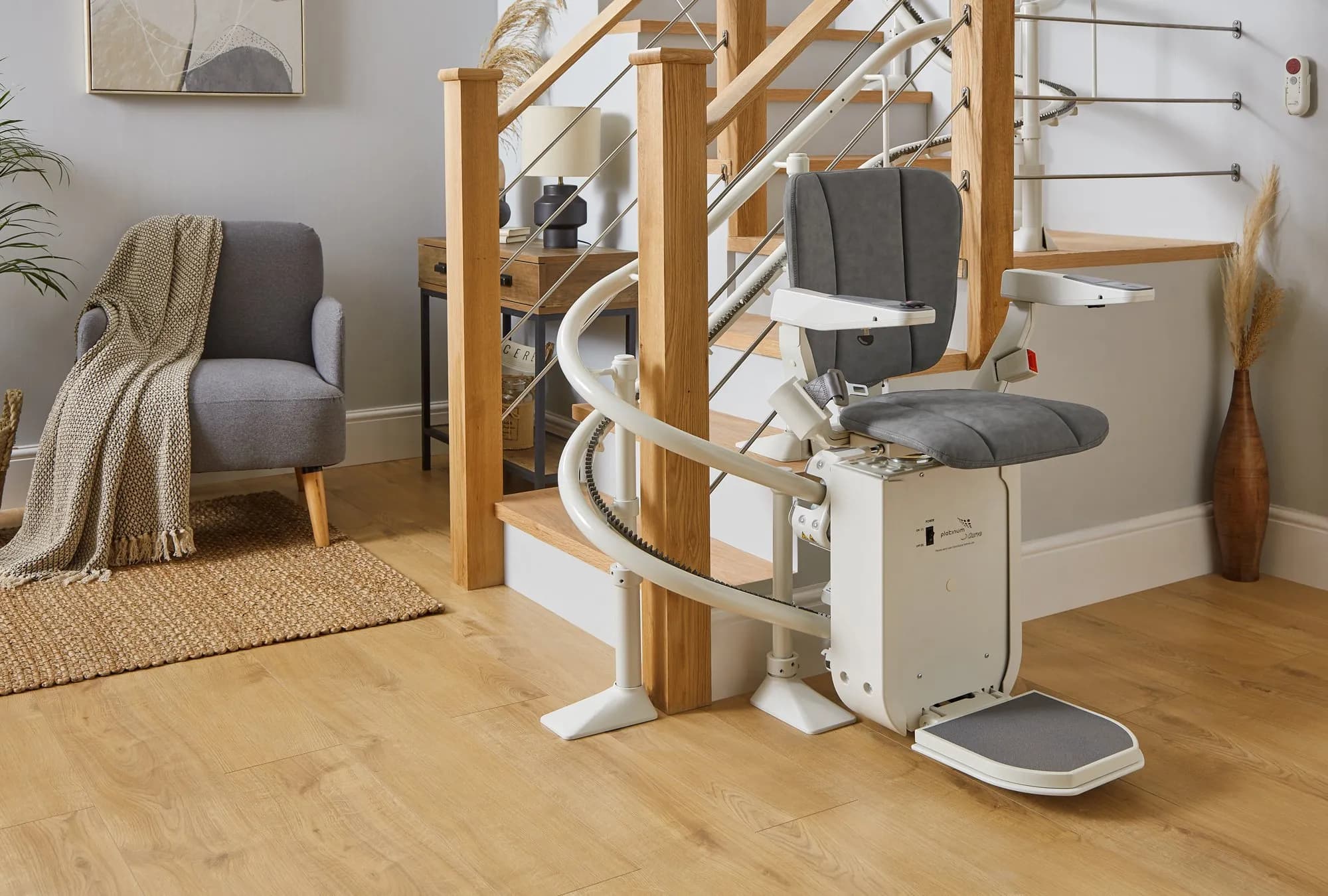 Nous avons installé un monte-escalier Platinum Stairlifts Curve pour un escalier tournant desservant deux étages chez un client à Vernaison (Rhône).